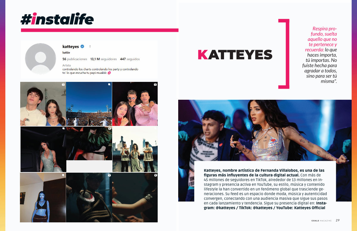 Katteyes, nombre artístico de Fernanda Villalobos, es una de las figuras más influyentes de la cultura digital actual. Con más de 45 millones de seguidores en TikTok, alrededor de 13 millones en Instagram y presencia activa en YouTube, su estilo, música y contenido lifestyle la han convertido en un fenómeno global que trasciende generaciones. Su feed es un espacio donde moda, música y autenticidad convergen, conectando con una audiencia masiva que sigue sus pasos en cada lanzamiento y tendencia. Sigue su presencia digital en: Instagram: @ katteyes / TikTok: @ katteyes / YouTube: Katteyes Official