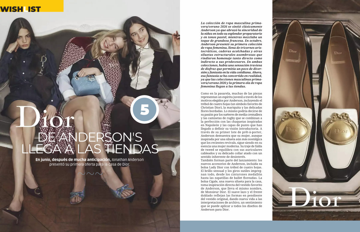Como en la pasarela, muchas de las piezas representan un espíritu juvenil a través de los motivos elegidos por Anderson, incluyendo el trébol de cuatro hojas( un símbolo favorito de Christian Dior), la mariquita y las delicadas flores bordadas. Lo mismo podría decirse de su pasión por los suéteres de media cremallera y las camisetas de rugby que se combinan a la perfección con las chaquetas inspiradas en Napoleón y las capas de punto que han llegado a definir su visión introductoria. A través de su primer lote de prêt-à-porter, Anderson demuestra que su mujer, aunque inspirada por una silueta aún más nostálgica que los recientes revivals, sigue siendo en su esencia una mujer moderna. Su traje de falda de tweed se equilibra con sus auriculares cableados y su delicado collar atado con un sentido inherente de desinterés. También forman parte del lanzamiento: los nuevos accesorios de Anderson, incluida su bolsa Lady Dior con trébol de cuatro hojas. El brillo sensual y los giros sutiles impregnan todo, desde los cinturones medallón hasta las zapatillas de ballet floreadas. La bolsa Cigale, una nueva silueta para la casa, toma inspiración directa del vestido favorito de Anderson, que lleva el mismo nombre, de Monsieur Dior. El suave lazo y el frente doblado reflejan las formas en pendiente del vestido original, dando nueva vida a las interpretaciones de archivo, un sentimiento que se puede aplicar a todos los diseños de Anderson para Dior.