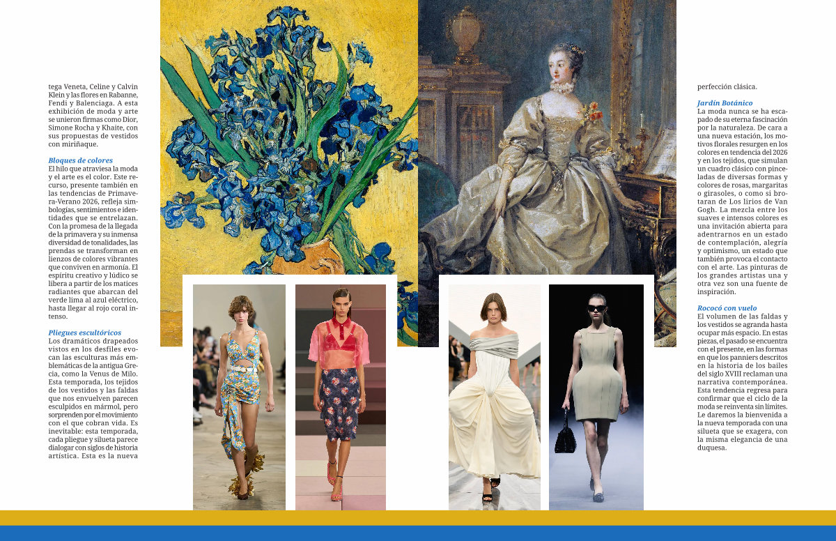 Jardín Botánico La moda nunca se ha escapado de su eterna fascinación por la naturaleza. De cara a una nueva estación, los motivos florales resurgen en los colores en tendencia del 2026 y en los tejidos, que simulan un cuadro clásico con pinceladas de diversas formas y colores de rosas, margaritas o girasoles, o como si brotaran de Los lirios de Van Gogh. La mezcla entre los suaves e intensos colores es una invitación abierta para adentrarnos en un estado de contemplación, alegría y optimismo, un estado que también provoca el contacto con el arte. Las pinturas de los grandes artistas una y otra vez son una fuente de inspiración.