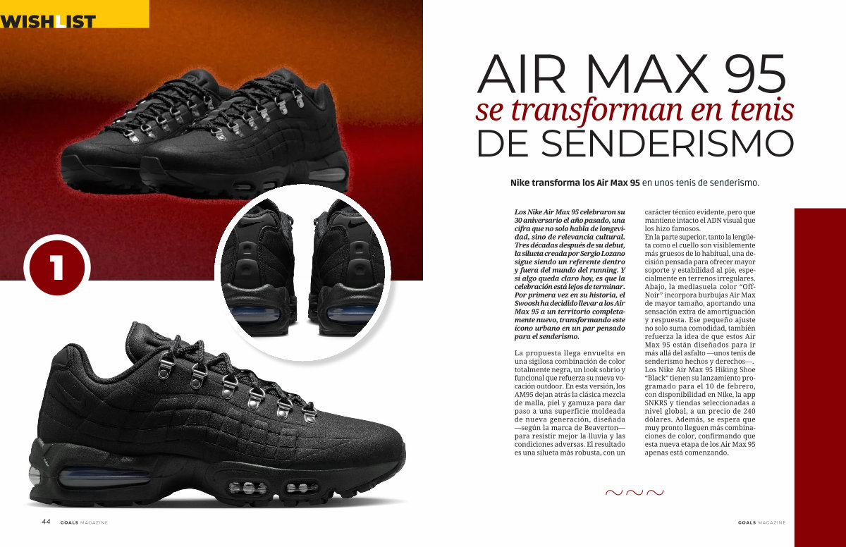 La propuesta llega envuelta en una sigilosa combinación de color totalmente negra, un look sobrio y funcional que refuerza su nueva vocación outdoor. En esta versión, los AM95 dejan atrás la clásica mezcla de malla, piel y gamuza para dar paso a una superficie moldeada de nueva generación, diseñada— según la marca de Beaverton— para resistir mejor la lluvia y las condiciones adversas. El resultado es una silueta más robusta, con un carácter técnico evidente, pero que mantiene intacto el ADN visual que los hizo famosos. En la parte superior, tanto la lengüeta como el cuello son visiblemente más gruesos de lo habitual, una decisión pensada para ofrecer mayor soporte y estabilidad al pie, especialmente en terrenos irregulares. Abajo, la mediasuela color“ Off- Noir” incorpora burbujas Air Max de mayor tamaño, aportando una sensación extra de amortiguación y respuesta. Ese pequeño ajuste no solo suma comodidad, también refuerza la idea de que estos Air Max 95 están diseñados para ir más allá del asfalto— unos tenis de senderismo hechos y derechos—. Los Nike Air Max 95 Hiking Shoe“ Black” tienen su lanzamiento programado para el 10 de febrero, con disponibilidad en Nike, la app SNKRS y tiendas seleccionadas a nivel global, a un precio de 240 dólares. Además, se espera que muy pronto lleguen más combinaciones de color, confirmando que esta nueva etapa de los Air Max 95 apenas está comenzando.