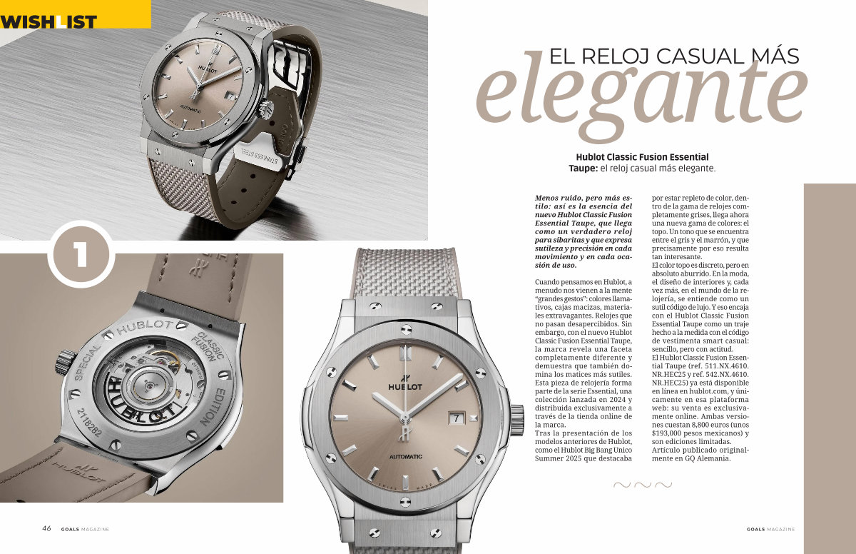 Cuando pensamos en Hublot, a menudo nos vienen a la mente“ grandes gestos”: colores llamativos, cajas macizas, materiales extravagantes. Relojes que no pasan desapercibidos. Sin embargo, con el nuevo Hublot Classic Fusion Essential Taupe, la marca revela una faceta completamente diferente y demuestra que también domina los matices más sutiles. Esta pieza de relojería forma parte de la serie Essential, una colección lanzada en 2024 y distribuida exclusivamente a través de la tienda online de la marca. Tras la presentación de los modelos anteriores de Hublot, como el Hublot Big Bang Unico Summer 2025 que destacaba por estar repleto de color, dentro de la gama de relojes completamente grises, llega ahora una nueva gama de colores: el topo. Un tono que se encuentra entre el gris y el marrón, y que precisamente por eso resulta tan interesante. El color topo es discreto, pero en absoluto aburrido. En la moda, el diseño de interiores y, cada vez más, en el mundo de la relojería, se entiende como un sutil código de lujo. Y eso encaja con el Hublot Classic Fusion Essential Taupe como un traje hecho a la medida con el código de vestimenta smart casual: sencillo, pero con actitud. El Hublot Classic Fusion Essential Taupe( ref. 511. NX. 4610. NR. HEC25 y ref. 542. NX. 4610. NR. HEC25) ya está disponible en línea en hublot. com, y únicamente en esa plataforma web: su venta es exclusivamente online. Ambas versiones cuestan 8,800 euros( unos $ 193,000 pesos mexicanos) y son ediciones limitadas. Artículo publicado originalmente en GQ Alemania.