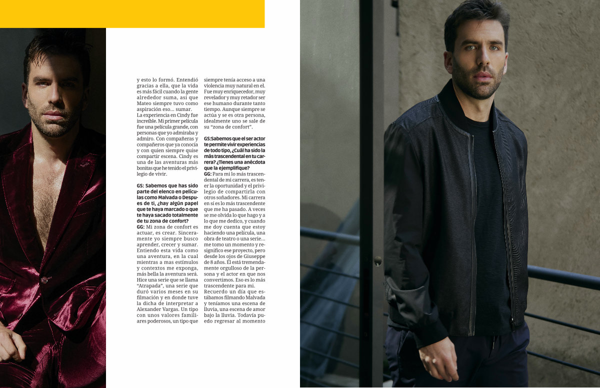 GS: Sabemos que has sido parte del elenco en películas como Malvada o Despues de ti, ¿ hay algún papel que te haya marcado o que te haya sacado totalmente de tu zona de confort? GG: Mi zona de confort es actuar, es crear. Sinceramente yo siempre busco aprender, crecer y sumar. Entiendo esta vida como una aventura, en la cual mientras a mas estímulos y contextos me exponga, más bella la aventura será. Hice una serie que se llama“ Atrapada”, una serie que duró varios meses en su filmación y en donde tuve la dicha de interpretar a Alexander Vargas. Un tipo con unos valores familiares poderosos, un tipo que siempre tenía acceso a una violencia muy natural en el. Fue muy enriquecedor, muy revelador y muy retador ser ese humano durante tanto tiempo. Aunque siempre se actúa y se es otra persona, idealmente uno se sale de su“ zona de confort”.