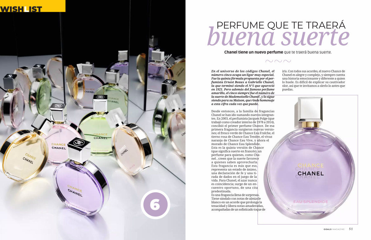 Desde entonces, a la familia de fragancias Chanel se han ido sumando nuevos integrantes. En 2003, el perfumista Jacques Polge( que trabajó como creador interno de 1978 a 2014), concibió el primer perfume Chance. De esa primera fragancia surgieron nuevas versiones; el fresco verde de Chance Eau Fraîche, el tierno rosa de Chance Eau Tendre, el vivaz naranja de Chance Eau Vive, y ahora el morado de Chance Eau Splendide. Esta es la quinta versión de Chance( que significa suerte en francés), un perfume para quienes, como Chanel, creen que la suerte favorece a quienes saben aprovecharla. Esta fragancia es más que eso, representa un estado de ánimo, una declaración de fe y una tirada de dados en el juego de la vida. Para Chanel, el azar nunca es coincidencia; surge de un encuentro oportuno, de una cita predestinada. Es una fragancia llena de sorpresas. Tiene sándalo con notas de almizcle blanco en un acorde que prolonga la tenacidad y libera notas amaderadas, acompañadas de un sofisticado toque de
