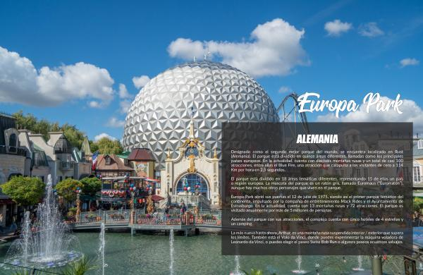Designado como el segundo mejor parque del mundo , se encuentra localizado en Rust ( Alemania ). El parque está dividido en quince áreas diferentes , llamadas como los principales países europeos . En la actualidad , cuenta con dieciséis montañas rusas y un total de casi 100 atracciones , entre ellas el Blue Fire , una atracción que catapulta a los visitantes de cero a 114 Km por hora en 2,5 segundos .