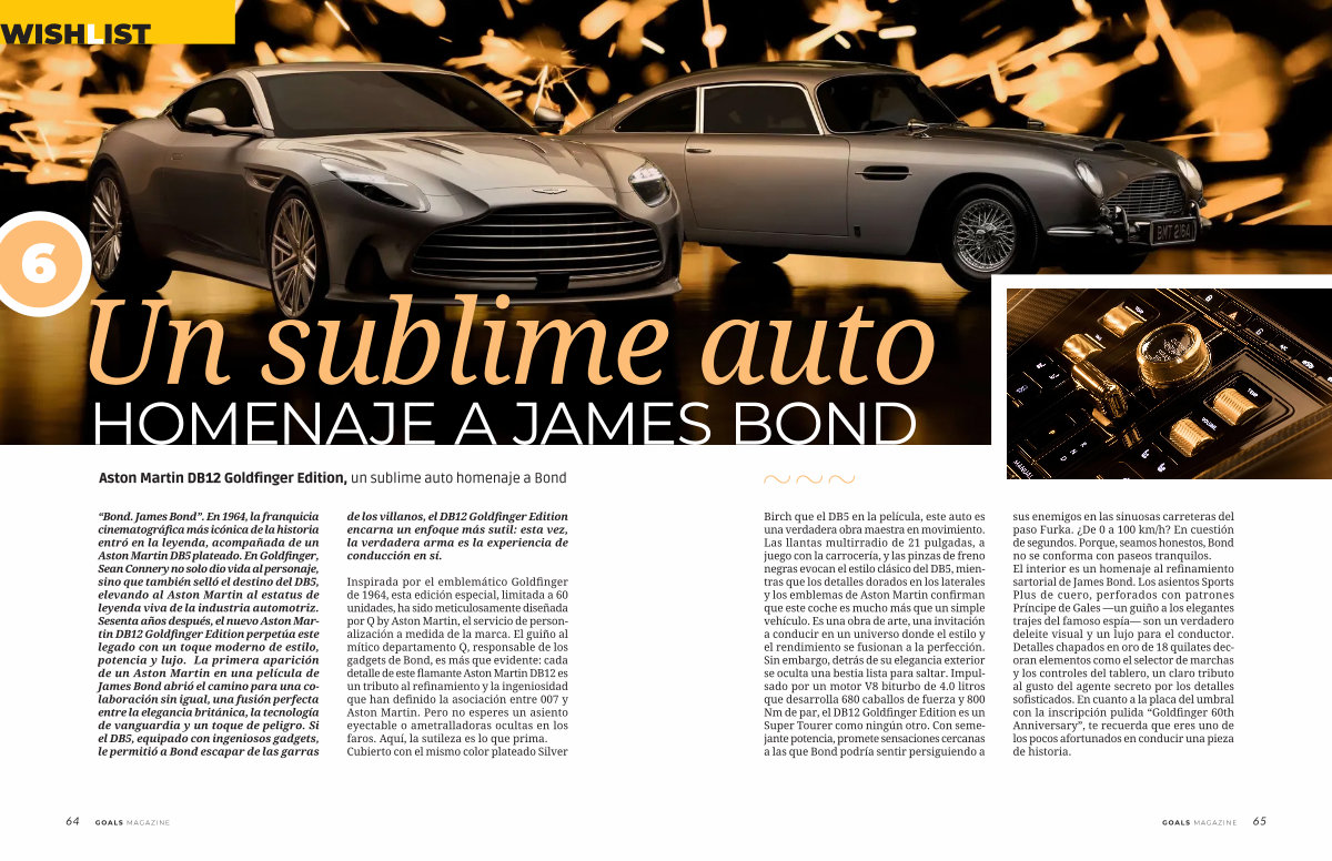 “ Bond. James Bond”. En 1964, la franquicia cinematográfica más icónica de la historia entró en la leyenda, acompañada de un Aston Martin DB5 plateado. En Goldfinger, Sean Connery no solo dio vida al personaje, sino que también selló el destino del DB5, elevando al Aston Martin al estatus de leyenda viva de la industria automotriz. Sesenta años después, el nuevo Aston Martin DB12 Goldfinger Edition perpetúa este legado con un toque moderno de estilo, potencia y lujo. La primera aparición de un Aston Martin en una película de James Bond abrió el camino para una colaboración sin igual, una fusión perfecta entre la elegancia británica, la tecnología de vanguardia y un toque de peligro. Si el DB5, equipado con ingeniosos gadgets, le permitió a Bond escapar de las garras de los villanos, el DB12 Goldfinger Edition encarna un enfoque más sutil: esta vez, la verdadera arma es la experiencia de conducción en sí.