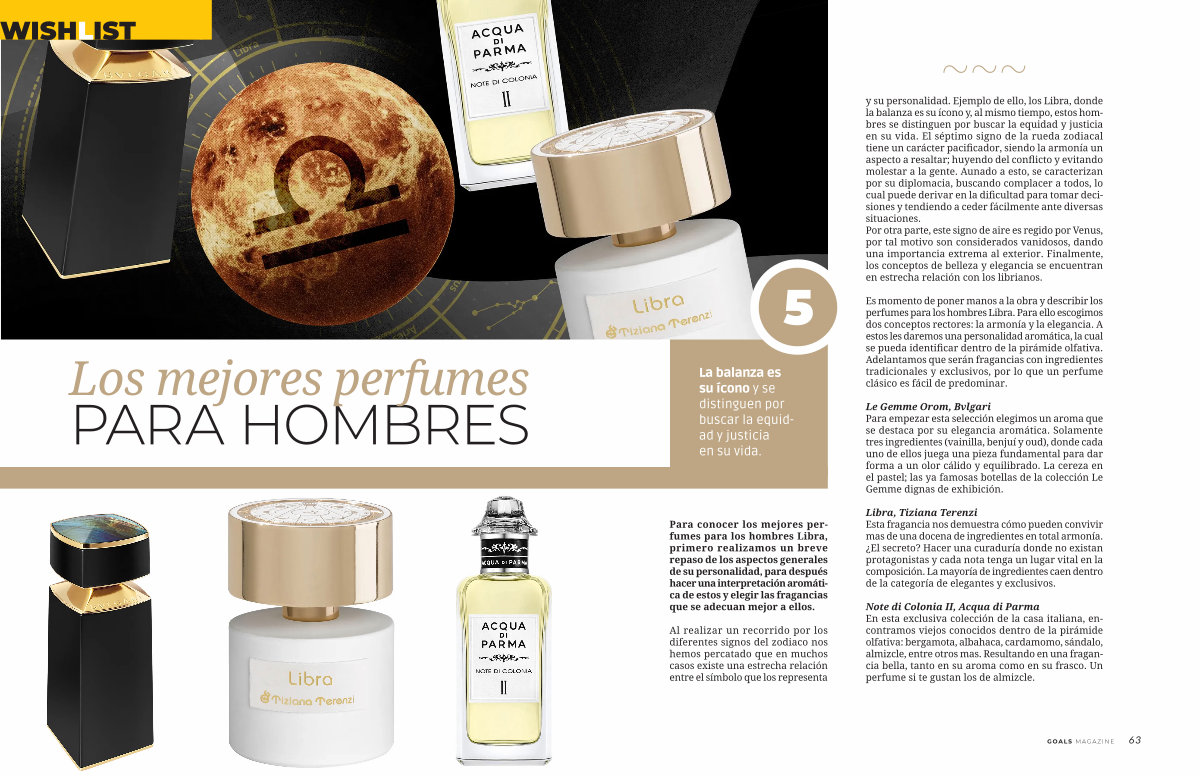 Es momento de poner manos a la obra y describir los perfumes para los hombres Libra. Para ello escogimos dos conceptos rectores: la armonía y la elegancia. A estos les daremos una personalidad aromática, la cual se pueda identificar dentro de la pirámide olfativa. Adelantamos que serán fragancias con ingredientes tradicionales y exclusivos, por lo que un perfume clásico es fácil de predominar.