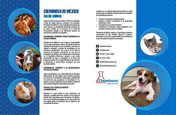 Cheminova de México es una empresa comprometida con la salud y bienestar animal , ofreciendo productos veterinarios fabricados con los estándares más altos de calidad y orientado a atender las necesidades de los criadores y productores . Con el paso de los años la empresa ha logrado convertirse en uno de los principales proveedores de medicamentos veterinarios en la República Mexicana , gracias a que están convencidos de que la innovación es el motor del progreso y la base de la competitividad , lo que los lleva a desarrollar y comercializar productos con una excelente calidad .