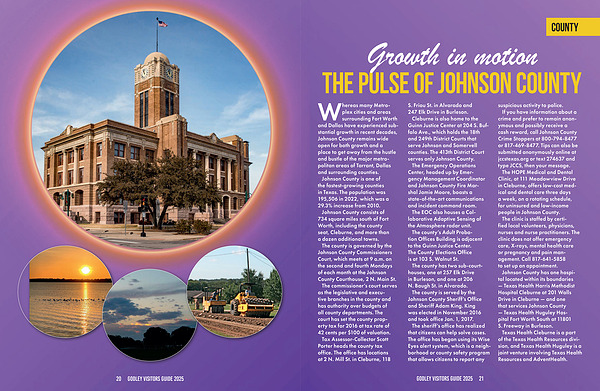 Johnson County consists of 734 square miles south of Fort Worth, including the county seat, Cleburne, and more than a dozen additional towns.