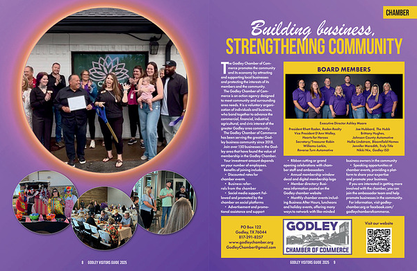 The Godley Chamber of Commerce promotes the community and its economy by attracting and supporting local businesses and protecting the interests of its members and the community.