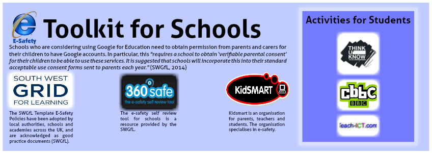 Schools who are considering using Google for Education need to obtain permission from parents and carers for their children to have Google accounts. In particular, this "requires a school to obtain ‘verifiable parental consent’ for their children to be able to use these services. It is suggested that schools will incorporate this into their standard acceptable use consent forms sent to parents each year." (SWGfL, 2014)