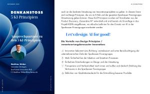 Ansprechpartner zu den 5 KI-Prinzipien : auch an die konkrete Umsetzung von Innovationsprojekten zu gehen . In diesem Sinne sind sie Design Prinzipien , die uns im S-Hub und der gesamten Sparkassen-Finanzgruppe Orientierung geben können . Diese fünf Prinzipien wurden auf Vorarbeiten aus der Product Discovery „ Generative KI “ entwickelt und sind bereits als Grundlage in das Projekt KISPA eingeflossen , wo ethische Leitlinien für den Einsatz von KI in der Sparkassen-Finanzgruppe erarbeitet werden .