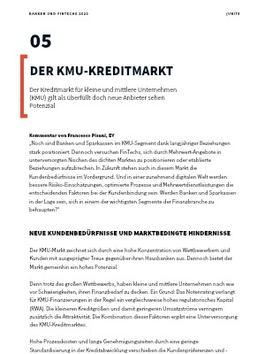 Kommentar von Francesco Pisani, EY „Noch sind Banken und Sparkassen im KMU-Segment dank langjähriger Beziehungen stark positioniert. Dennoch versuchen FinTechs, sich durch Mehrwert-Angebote in unterversorgten Nischen des dichten Marktes zu positionieren oder etablierte Beziehungen aufzubrechen. In Zukunft stehen auch in diesem Markt die Kundenbedürfnisse im Vordergrund. Und in einer zunehmend digitalen Welt werden bessere Risiko-Einschätzungen, optimierte Prozesse und Mehrwertdienstleistungen die entscheidenden Faktoren bei der Kundenbindung sein. Werden Banken und Sparkassen in der Lage sein, sich in einem der wichtigsten Segmente der Finanzbranche zu behaupten?“