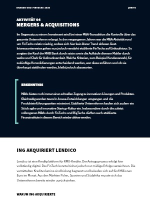 M&As bieten noch immer einen schnellen Zugang zu innovativen Lösungen und Produkten. Gleichzeitig werden teure In-house-Entwicklungen umgangen und die Produkteinführungszeiten minimiert. Etablierte Unternehmen kaufen sich zudem ein Stück agile und innovative Startup-Kultur ein. Insbesondere durch die zuletzt vollzogenen M&As durch FinTechs und BigTechs dürften auch etablierte Finanzinstitute in diesem Bereich wieder aktiver werden.