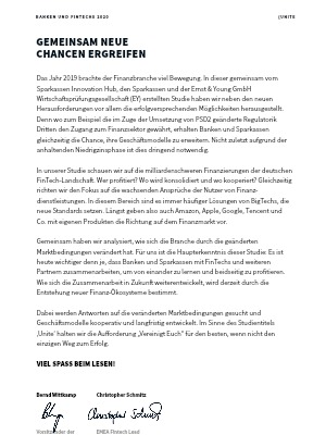 Das Jahr 2019 brachte der Finanzbranche viel Bewegung. In dieser gemeinsam vom Sparkassen Innovation Hub, den Sparkassen und der Ernst & Young GmbH Wirtschaftsprüfungsgesellschaft (EY) erstellten Studie haben wir neben den neuen Herausforderungen vor allem die erfolgversprechenden Möglichkeiten herausgestellt. Denn wo zum Beispiel die im Zuge der Umsetzung von PSD2 geänderte Regulatorik Dritten den Zugang zum Finanzsektor gewährt, erhalten Banken und Sparkassen gleichzeitig die Chance, ihre Geschäftsmodelle zu erweitern. Nicht zuletzt aufgrund der anhaltenden Niedrigzinsphase ist dies dringend notwendig.