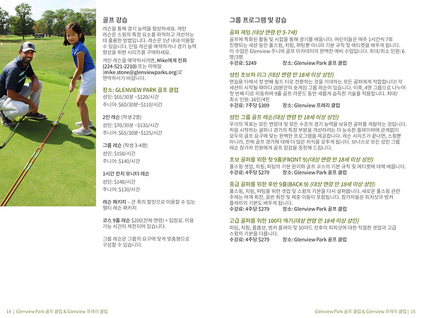 장소 : GLENVIEW PARK 골프 클럽 성인 : $ 65 / 30 분 ~$ 120 / 시간 주니어 : $ 60 / 30 분 ~$ 110 / 시간