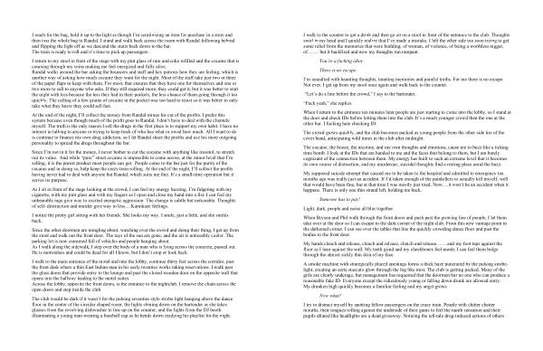 At the end of the night , I ’ ll collect the money from Randal minus his cut of the profits . I prefer this system because even though much of the profit goes to Randal , I don ’ t have to deal with the clientele myself . The truth is the only reason I sell the drugs in the first place is to support my own habit . I have no interest in talking to anyone or trying to keep track of who has what or owed how much . All I want to do is continue to finance my own drug addiction , so I let Randal share the profits and use his more outgoing personality to spread the drugs throughout the bar .