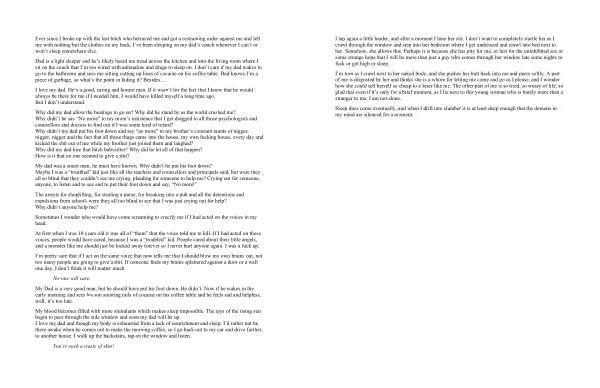 I tap again a little harder , and after a moment I hear her stir . I don ’ t want to completely startle her as I crawl through the window and step into her bedroom where I get undressed and crawl into bed next to her . Somehow , she allows this . Perhaps it is because she has pity for me , or lust for the uninhibited sex or some strange hope that I will be more than just a guy who comes through her window late some nights to fuck or get high or sleep .