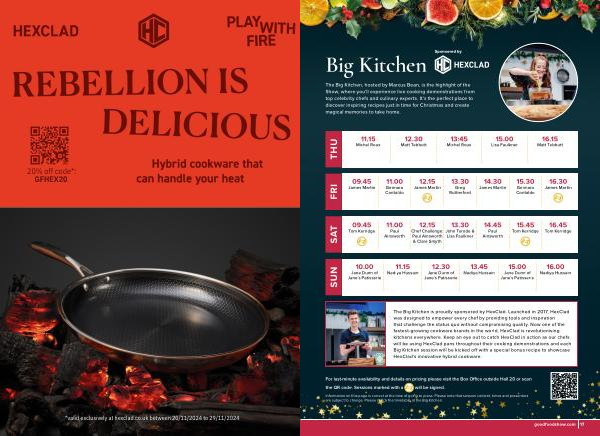 The Big Kitchen is proudly sponsored by HexClad . Launched in 2017 , HexClad was designed to empower every chef by providing tools and inspiration that challenge the status quo without compromising quality . Now one of the fastest-growing cookware brands in the world , HexClad is revolutionising kitchens everywhere . Keep an eye out to catch HexClad in action as our chefs will be using HexClad pans throughout their cooking demonstrations and each Big Kitchen session will be kicked off with a special bonus recipe to showcase HexClad ’ s innovative hybrid cookware .