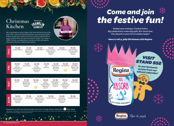 We ’ ve dedicated an entire stage to the most wonderful time of the year ! Take a seat at the Christmas Kitchen , sponsored by Franklin & Sons , and get your festive fix with live cookery demonstrations featuring both sweet and savoury seasonal recipes . This stage is FREE to attend , so simply drop in and let our chefs and experts dazzle you with their creative festive dishes .