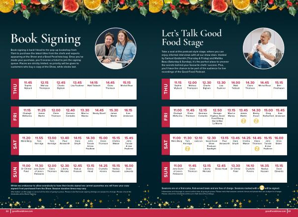 Information on this page is correct at the time of going to press . Please note that session content , times and presenters are subject to change . Please check the timetable at the Let ’ s Talk Good Food Stage . goodfoodshow . com 23