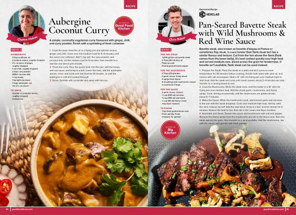 1 Prepare the Steak : Place the steak on a plate and let it come to room temperature for 30 minutes before cooking . Drizzle both sides with olive oil , and season with salt and pepper . Heat a 12 ” ( 30 cm ) frying pan over medium-high to high heat . Add the steak and cook until nicely seared , about 2 – 4 minutes per side . Transfer to a carving board to rest . 2 Cook the Mushrooms : While the steak rests , melt the butter in a 10 ” ( 20 cm ) frying pan over medium heat . Add the sliced garlic , mushrooms , and thyme sprigs . Cook , stirring occasionally , until the mushrooms are golden-brown , about 5 – 7 minutes . 3 Make the Sauce : While the mushrooms cook , add minced garlic and red wine to the pan with the steak drippings . Cook over medium-high heat , stirring , until the wine reduces by half . Add the veal stock , bring to a boil , and let simmer for 2 minutes . Reduce the heat to low , then stir in the cream and Dijon mustard . 4 Assemble and Serve : Season the sauce and mushrooms with salt and pepper . Remove the thyme sprigs from the mushrooms and stir in the lemon zest . Slice the steak against the grain , then transfer to a serving platter . Add the mushrooms , top with the sauce , and garnish with fresh parsley . goodfoodshow . com 35