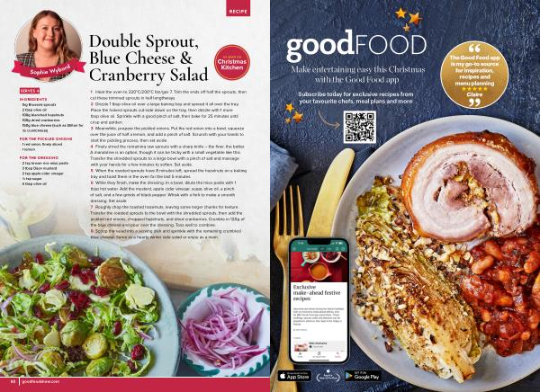 1 Heat the oven to 220 ° C / 200 ° C fan / gas 7 . Trim the ends off half the sprouts , then cut these trimmed sprouts in half lengthways . 2 Drizzle 1 tbsp olive oil over a large baking tray and spread it all over the tray . Place the halved sprouts cut-side down on the tray , then drizzle with 1 more tbsp olive oil . Sprinkle with a good pinch of salt , then bake for 25 minutes until crisp and golden . 3 Meanwhile , prepare the pickled onions . Put the red onion into a bowl , squeeze over the juice of half a lemon , and add a pinch of salt . Scrunch with your hands to start the pickling process , then set aside . 4 Finely shred the remaining raw sprouts with a sharp knife – the finer , the better . A mandoline is an option , though it can be tricky with a small vegetable like this . Transfer the shredded sprouts to a large bowl with a pinch of salt and massage with your hands for a few minutes to soften . Set aside . 5 When the roasted sprouts have 8 minutes left , spread the hazelnuts on a baking tray and toast them in the oven for the last 5 minutes . 6 While they finish , make the dressing . In a bowl , dilute the miso paste with 1 tbsp hot water . Add the mustard , apple cider vinegar , sugar , olive oil , a pinch of salt , and a few grinds of black pepper . Whisk with a fork to make a smooth dressing . Set aside . 7 Roughly chop the toasted hazelnuts , leaving some larger chunks for texture . Transfer the roasted sprouts to the bowl with the shredded sprouts , then add the pickled red onions , chopped hazelnuts , and dried cranberries . Crumble in 120g of the blue cheese and pour over the dressing . Toss well to combine . 8 Scoop the salad into a serving dish and sprinkle with the remaining crumbled blue cheese . Serve as a hearty winter side salad or enjoy as a main .