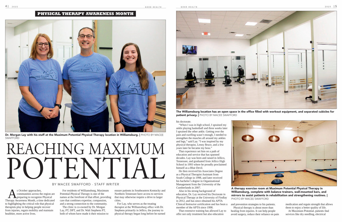 A therapy exercise room at Maximum Potential Physical Therapy in Williamsburg, complete with balance trainers, wall-mounted bars, and mirrors to assist patients in rehabilitation and strengthening routines. | PHOTO BY MACEE SWAFFORD