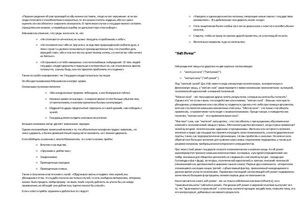 При этом к hard power государств относятся экономическая и военная мощь. А soft power характеризуется тремя основными компонентами: во-первых, культурой( определяемой как набор значимых для общества ценностей, не сводимый к массовой культуре- продукции Голливуда и фаст-фуду), во-вторых, политической идеологией, в-третьих, внешней политикой( понимаемой как дипломатией в широком смысле слова). Первые два компонента- исторически сложившееся наследие нации, третий- субъективный фактор, привносимый находящимися в данное время у власти политиками. Параметры последней составляющей soft power подвержены значительно большим флуктуациям, нежели первых двух ее компонентов.