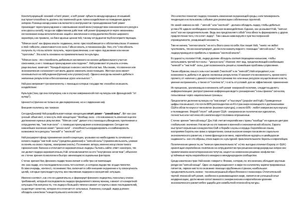 " Мягкая сила- это способность добиваться желаемого на основе добровольного участия союзников, а не с помощью принуждения или подачек ". Най развивает эту мысль и очень рационально замечает: " Каждый хорошо знаком с жесткой властью. Мы знаем, что военная или экономическая сила может заставить других изменить свою позицию. Жесткая сила может основываться на побуждении( пряник) или угрозах( кнут). Однако иногда вы можете добиться желаемых результатов и без осязаемых угроз или выплат. ".