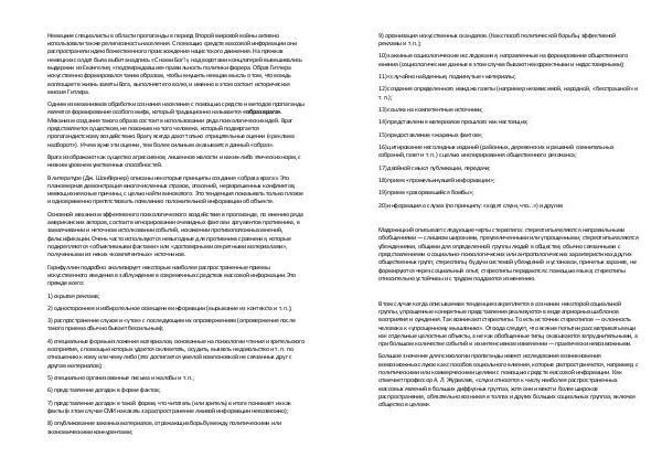 Основной механизм эффективного психологического воздействия в пропаганде, по мнению ряда американских авторов, состоит в игнорировании очевидных фактов и аргументов противника, в замалчивании и неточном истолковании событий, искажении противоположных мнений, фальсификации. Очень часто используются невыгодные для противника сравнения, которые подкрепляются « объективными фактами » или « достоверными секретными материалами », полученными из неких « компетентных » источников.