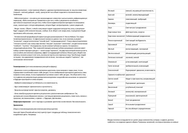 Николай Серов( Российский институт цвета) строит следующую таблицу психологического воздействия цвета. Например:
