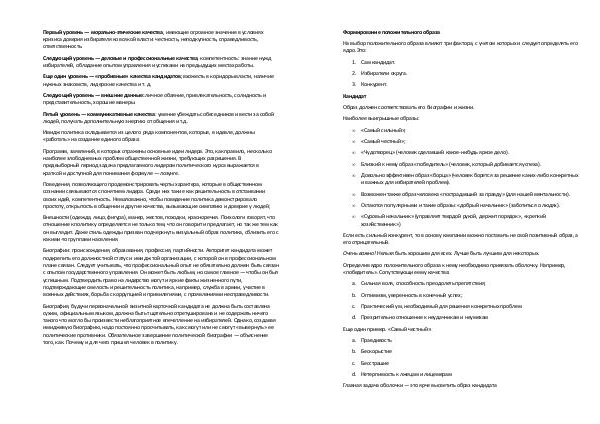 Первый уровень— морально-этические качества, имеющие огромное значение в условиях кризиса доверия избирателя ко всякой власти: честность, неподкупность, справедливость, ответственность.