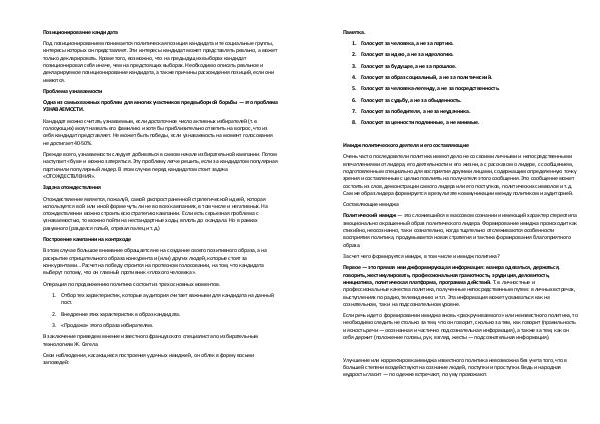 Памятка. 1. Голосуют за человека, а не за партию. 2. Голосуют за идею, а не за идеологию. 3. Голосуют за будущее, а не за прошлое. 4. Голосуют за образ социальный, а не за политический. 5. Голосуют за человека-легенду, а не за посредственность. 6. Голосуют за судьбу, а не за обыденность. 7. Голосуют за победителя, а не за неудачника. 8. Голосуют за ценности подлинные, а не мнимые.