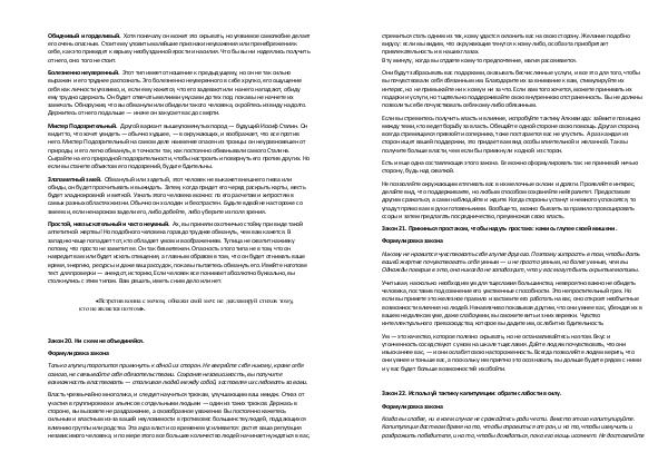 Простой, невзыскательный и часто неумный. Ах, вы приняли охотничью стойку при виде такой аппетитной жертвы! Но подобного человека гораздо труднее обмануть, чем вам кажется. В западню чаще попадает тот, кто обладает умом и воображением. Тупица не схватит наживку потому, что просто не заметит ее. Он так безмятежен. Опасность этого типа не в том, что он навредит вам или будет искать отмщения, а главным образом в том, что он будет отнимать ваше время, энергию, ресурсы и даже ваш рассудок, пока вы пытаетесь обмануть его. Имейте наготове тест для проверки— анекдот, историю, Если человек все понимает абсолютно буквально, вы столкнулись с этим типом. Вам решать, иметь с ним дело или нет.