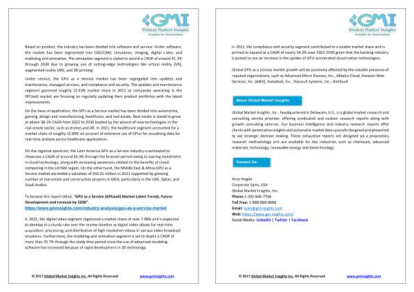 Under service , the GPU as a Service market has been segregated into updates and maintenance , managed services , and compliance and security . The updates and maintenance segment garnered roughly 22.43 % market share in 2021 as companies operating in the GPUaaS market are focusing on regularly updating their product portfolios with the latest improvements .