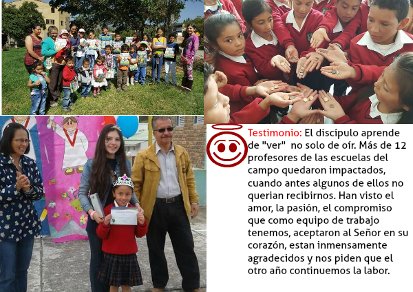 Testimonio: El discípulo aprende de "ver" no solo de oír. Más de 12 profesores de las escuelas del campo quedaron impactados, cuando antes algunos de ellos no querian recibirnos. Han visto el amor, la pasión, el compromiso que como equipo de trabajo tenemos, aceptaron al Señor en su corazón, estan inmensamente agradecidos y nos piden que el otro año continuemos la labor.