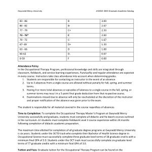 Attendance Policy In the Occupational Therapy Program , professional knowledge and skills are integrated through classroom , fieldwork , and service-learning experiences . Punctuality and regular attendance are expected in every course . Instructors take class attendance into account when determining grades . 1 . Students are responsible for contacting an instructor in the event of an absence . 2 . Up to 3 absences from a single course are allowed without penalty for fall , spring , and summer terms . 3 . Having 4 or more total absences or episodes of lateness to a single course in the fall , spring , or summer terms may result in a 5-point final grade deduction from that respective course . 4 . Examinations missed due to absence will only be rescheduled at the discretion of the instructor and proper notification of the absence was given prior to the exam .
