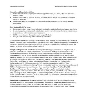 Compliance Requirements and Clearances : Occupational therapy students must be compliant with all clearance and health and wellness requirements . At the onset of the Program , students will be sent information and instructions for access to the Complio system . Clearance and health and wellness requirements are annual , so they will need to be redone the following year to remain in compliance . Failure to adhere to the required compliance deadlines may result in course grade deductions and a nonapproval to register for the subsequent Program term . Clearance and health and wellness requirements for the Entry-level Master of Science in Occupational Therapy Program include : PA State Police background check , PA child abuse clearance , FBI fingerprints , completion of Act 126 — “ Child Abuse Recognition and Reporting Training ” ( Please note that this is a 3-hour online training certificate and NOT the PA child abuse clearance , American Heart Association Heart Saver First Aid , CPR , AED Certification ( Please note that no exceptions will be made for any other certification ), Medical history / physical examination , Vaccinations that include MMR , Varicella , Hepatitis B , Tdap , Tuberculosis , Drug Screening , Flu Shot , and Meningitis . An adverse background check can restrict a student ’ s ability to access fieldwork , affect a graduate ’ s ability to sit for the NBCOT ® certification examination , or attain state licensure as an occupational therapist .