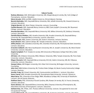 Adjunct Faculty Rodney Altemose , EdD , Wilmington University ; MS , Shippensburg University ; BA , York College of Pennsylvania . Lecturer , Education . Maria Arevalo , MSN and BSN , LaSalle University , Clinical Adjunct , Nursing . Beverly Barksdale , EdD , Gwynedd Mercy University ; MA , LaSalle University ; BA , Howard University . Lecturer , Education . Virginia Barrett , MS , West Chester University . Lecturer , Counseling . Cynthia Bennett , EdD , Gwynedd Mercy University ; MEd , Saint Joseph ’ s University ; BA , Rosemont College . Lecturer , Education . Amanda Benolken , EdD , Gwynedd Mercy University ; MS , Wilkes University ; BS , Salisbury University . Lecturer , Education . Danielle Bianco-Sheldon , EdD , Arcadia University ; MA , Arcadia University ; BS , Gwynedd Mercy University ; BS , Gwynedd Mercy University . Lecturer , Education . Thomas Boyle , MBA , Eastern University ; BA , Eastern University . Lecturer , Business . Jessica Brasch , MEd , Cabrini College ; BA , Temple University . Lecturer , Education . Jeffrey Brown , EdD , Columbia University ; MS , Columbia University ; BA , Pennsylvania State University . Lecturer , Education . Ernestine Caldwell , EdD , Nova Southeastern University ; MS , St . Joseph ' s University ; BS , West Chester University . Lecturer , Education . Angela Campbell , Ph . D . Temple University ; MA University of Maryland , College Park ; BA La Salle University . Jill Clark , EdD , Widener University ; MEd , Widener University ; MEd , Temple University ; BA , Penn State University . Lecturer , Education . Megan Clementi , EdD , Gwynedd Mercy University ; M . S . Ed , Cabrini University ; MS , BS , Villanova University . Lecturer , Education . George Colton , EdD Rutgers University ; M . A . New York University ; BA Rutgers University . Lecturer , Counseling . John Cost , MBA DeSales University , BS , Trenton State College ; AS , Bucks County Community College . Lecturer , Business . Jennifer Craig , MS , Drexel University ; BA , Communication and Rhetoric . Lecturer , Education . Karen Czarny , MEd , Arcadia University ; BS , Pennsylvania State University . Lecturer , Education . Mark Daria , MA , University of San Diego ; MBA , Woodbury College ; MS , University of Stockholm . Lecturer , Arts & Science , Business . Kathleen Davis , PhD , University of South Carolina ; MA , Rowan University ; BS , St . Francis University . Lecturer , Education . Karen DeVose , EdD , Gwynedd Mercy University ; MEd , Cheyney University of Pennsylvania ; BS , Mansfield University of Pennsylvania . Lecturer , Education . Stefanie Diaz , MS , OTR / L , CHT , Thomas Jefferson University . Lecturer , Occupational Science and Occupational Therapy . Lauren DiFernando , MS , Gwynedd Mercy University ; BS , Kutztown University . Lecturer , Education Laura Dowling , PhD University of Phoenix ; MBA , West Chester University ; BA . Lecturer , Arts & Science , Business . Amelia Drobile , MBA , Holy Family University ; BS , Gwynedd Mercy University . Lecturer , Business .