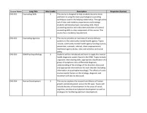 Students will be introduced and learn to apply the mental health diagnostic system found in the DSM . Topics include ; diagnostic interviewing skills , appropriate classification of a group of symptoms into a differential diagnosis , understanding of the etiology of the disorders discussed and appropriate interventions for each disorder ( including information on psychopharmacology ). The effects of socioenvironmental factors on the etiology , diagnosis and treatment will also be discussed . |