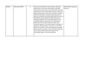This course is the third in a series of three internship experiences in the clinical mental health counseling concentration . Over the course of these three internship experiences clinical mental health counselor trainees will progressively perform all the tasks and duties ascribed to clinical mental health counselors as prescribed by the American Counselor Association ( ACA ) and the Council for Accreditation of Counseling and Related Educational Programs ( CACREP ). These internship experiences are completed under the supervision of an experienced professional clinical mental health counselor and a university supervisor . This course requires a minimum of 200 hours of field experience over the course of fifteen weeks and includes 1.5 hours of mandatory synchronous group supervision weekly . Further information about this course and its requirements can be found in the Counseling Program ' s Internship Handbook . |