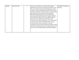 This course is the first in a series of three internship experiences in the school counseling concentration . Over the course of these three internship experiences school counselor trainees will progressively perform all the tasks and duties ascribed to school counselors as determined by the American School Counselor Association ( ASCA ) National Model and the Council for Accreditation of Counseling and Related Educational Programs ( CACREP ). These internship experiences are completed under the supervision of an experienced professional school counselor and a university supervisor . This course requires a minimum of 200 hours of field experience over the course of fifteen weeks and includes 1.5 hours of mandatory synchronous group supervision weekly . Further information about this course and its requirements can be found in the Counseling Program ' s Internship Handbook . |
