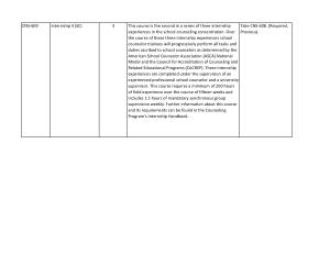 This course is the second in a series of three internship experiences in the school counseling concentration . Over the course of these three internship experiences school counselor trainees will progressively perform all tasks and duties ascribed to school counselors as determined by the American School Counselor Association ( ASCA ) National Model and the Council for Accreditation of Counseling and Related Educational Programs ( CACREP ). These internship experiences are completed under the supervision of an experienced professional school counselor and a university supervisor . This course requires a minimum of 200 hours of field experience over the course of fifteen weeks and includes 1.5 hours of mandatory synchronous group supervision weekly . Further information about this course and its requirements can be found in the Counseling Program ' s Internship Handbook . |