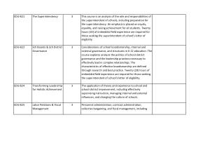 3 Considerations of school boardsmanship , internal and external governance , and structures in K-12 education . The course explores analysis the politics of school district governance and the leadership practices necessary to effectively lead in complex relationships . The characteristics of effective boardsmanship are defined through research and best practice . Twenty ( 20 ) hours of embedded field experience are required for those seeking the superintendent of school ' s letter of eligibility .