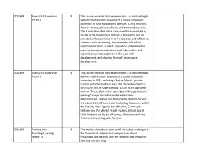 3 This course provides field experience in a school setting to perform the functions required of a special education supervisor in LEAs , including Charter Schools , private schools and intermediate units . The student enrolled in this course will be supervised by faculty or an approved mentor . The student will be provided with experience in : Leading Change , Discipline and manifestation determination , 504 Service Agreements , Related Service Providers , School Finance and budgeting , Resources within the District , Inter- Agency Coordination , Community Partners and the Mental Health System , School Board , Child Find and the Referral Process , Mediation and Due Process , and working with Parents .