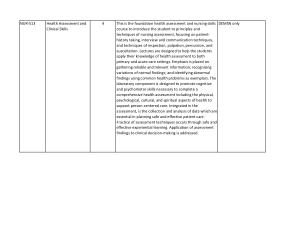 4 This is the foundation health assessment and nursing skills DEMSN only course to introduce the student to principles and techniques of nursing assessment , focusing on patienthistory taking , interview and communication techniques , and techniques of inspection , palpation , percussion , and auscultation . Lectures are designed to help the students apply their knowledge of health assessment to both primary and acute care settings . Emphasis is placed on gathering reliable and relevant information ; recognizing variations of normal findings ; and identifying abnormal findings using common health problems as exemplars . The laboratory component is designed to promote cognitive and psychomotor skills necessary to complete a comprehensive health assessment including the physical , psychological , cultural , and spiritual aspects of health to support person-centered care . Integrated in the assessment , is the collection and analysis of data which are essential in planning safe and effective patient care . Practice of assessment techniques occurs through safe and effective experiential learning . Application of assessment findings to clinical decision-making is addressed .