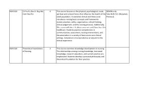4 This course focuses on the physical , psychological , social , DEMSN only spiritual and cultural forces that influence the health of the Take NUR-513 . ( Required , adult population . It combines clinical and theory and Previous ). introduces nursing basic concepts and frameworks ( communication , safety , organization , critical thinking , clinical judgement , and the nursing process ). Additionally , this course will also introduce common conditions found in healthcare . Students practice competencies in communication , assessment , nursing interventions , and documentation in a variety of basic acute care clinical settings . Simulation is incorporated as an adjunct to the clinical experience .