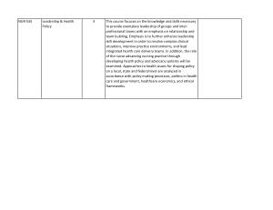 3 This course focuses on the knowledge and skills necessary to provide exemplary leadership of groups and interprofessional teams with an emphasis on relationship and team building . Emphasis is to further enhance leadership skill development in order to resolve complex clinical situations , improve practice environments , and lead integrated health care delivery teams . In addition , the role of the nurse advancing nursing practice through developing health policy and advocacy systems will be examined . Approaches to health issues for shaping policy on a local , state and federal level are analyzed in accordance with policy making processes , politics in health care and government , healthcare economics , and ethical frameworks .