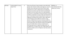 This course focuses on key concepts in care of the adult patient with selected complex acute diagnoses across the health-illness continuum by the Clinical Nurse Leader prepared nurse . There is specific focus on the physical , psychosocial , spiritual , and cultural forces impacting the complex and acute health status of the adult population . This course is a combination of theory and clinical . There is emphasis on graduate nursing concepts and frameworks in care of adult patient experiencing selected complex acute diagnoses including communication , safety , organization , critical thinking , clinical judgement and the nursing process . Additionally , this course introduces students to common complex acute diagnoses impacting body systems of the adult patient with selected complex acute diagnoses across the health-illness continuum . Students have learning opportunities to apply knowledge , skills , and competencies in complex acute care of adult patients with selected complex acute care diagnoses requiring complex nursing care . |