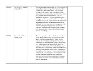 3 This course provides students with the theoretical base to assess , diagnose and manage the primary care of the newborn to 5-year-old population . Course content includes the principles of health promotion , disease prevention , and management of common primary health care problems in diverse newborn to 5-year-old populations . Emphasis is placed on the diagnosis and management of acute episodic and chronic conditions of newborns to 5-year old in the context of the primary care setting and community . Evidenced based practice is utilized as the basis for primary care management and decision-making including diagnosis , appropriate diagnostic procedures , laboratory tests , and follow up care . Clinical experiences are provided in a variety of primary care settings .